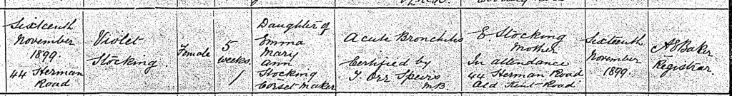 In the 1911 census, her father declared that he had had 19 children, three of whom had died. My search for evidence for their births and deaths led me to assume – incorrectly – that a baby called Violet Stocking, born and died in the last quarter of 1899 was one of them. Later in my research, I ordered her death certificate and was surprised to find that her mother was Emma Mary Ann Stocking. I then ordered her birth certificate. She was born at the family home of 44 Herman Road, when her Corset Maker mother was 21 years old and unmarried.