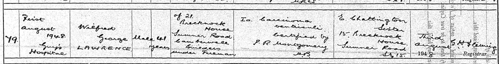Just under a decade later, Wilfred George Lawrence died, aged 41. He died in Guy’s Hospital in London on 1 August 1948, of Carcinoma Ventriculi (stomach cancer). His usual address is 21 Brecknock House, Sumner Road, and his occupation is recorded as Builder’s Under Foreman.