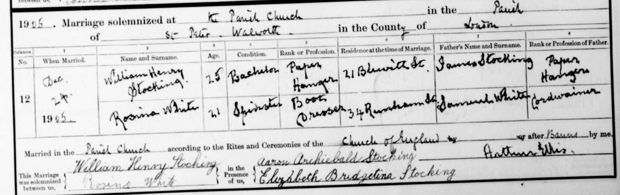 On Christmas Eve 1905, he married Rosina White at St Peter’s, Walworth. He was 25, she was 21, the daughter of a Cordwainer (shoemaker). William is now working as a Paper Hanger, as is his father. Rosina White is working – possibly for her father – as a Boots Dresser. The witnesses to the marriage are the groom’s brother, Aaron Archibald Stocking, and his sister, Elizabeth Bridgetina Stocking. William no longer seems to be living with his family; his home address is shown as 21 Blewett Street.