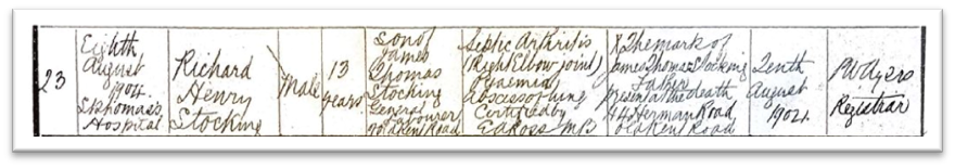 Richard died in St Thomas Hospital in London, described on his death certificate (extract below) as the son of James Thomas Stocking General Labourer of Old Kent Road. The cause of death is septic arthritis of the right elbow joint, pyaemia abcess of lung. His father, of 44 Herman Road, was present at the death.