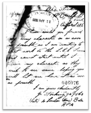 The previous month, he wrote to the Army requesting that they forward his ‘character’ (a reference) as he was waiting to start a new job with LCC Trams. He was entitled to the British War Medal and Victory Medal.