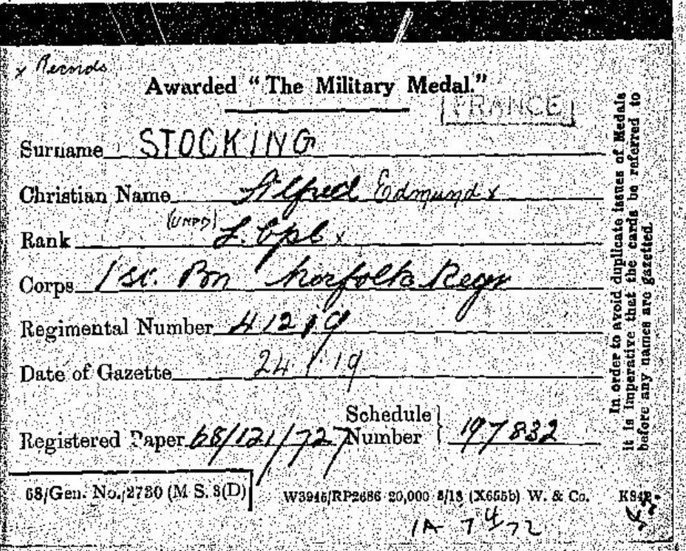 It seems that he was initially given regimental number 9120773, superseded by no 48226 and 41219. He was only 5’ 3” tall, but the rest of his description is illegible. He was wounded in action on 2 September 1918, receiving a shotgun wound to his face; his records show him being treated in hospitals in various parts of France, including Calais and Rouen, and his Military Medal appears to have been awarded after the end of the War, in January 1919 (date of the announcement in The Gazette). He was still only 21 years old. His older brother Aaron Archibald Stocking had also been awarded the Military Medal, but had been killed in action at the end of 1917. In faint handwriting on his service record is the annotation in the medal section saying that he was awarded the Military Medal. A separate record at FindMyPast also records the MM award.