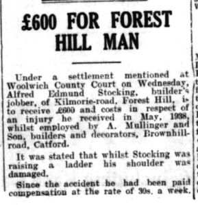 In 1938, he was working as a Builder’s Jobber for A Mullinger and Son, of Brownhill Road, Catford, when he sustained an injury to his shoulder. The Lewisham Borough News of 2 July 1940 reported that he had been raising a ladder when his shoulder was damaged, and he had been paid 30s compensation per week ever since. At Woolwich County Court, a settlement of £600 plus costs was finally made to him two years later, as reported in The Lewisham Borough News, 2 July 1940 (see left).