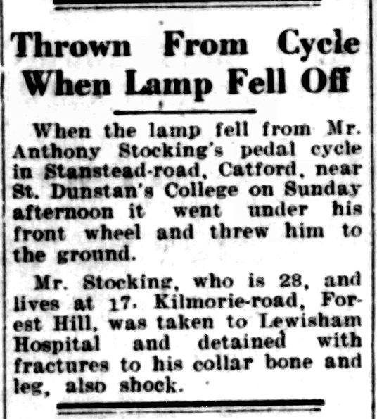In 1947, their eldest son Anthony Stocking married Winifred Elsie Summers in Deptford, where she grew up. They had two children: Paul Anthony Stocking, born in Poplar in 1953 and Adam Nicholas Stocking, born in Woolwich in 1956. In 1953, he suffered an unfortunate accident while riding his bike in Stanstead Road, Catford, as reported in Lewisham Borough News on 20 October that year (right), not long after the birth of his eldest son.