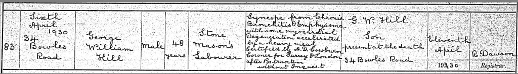 It is possible that his various occupations working with coal, gas and stone all contributed to his cause of death. This is described in lengthy terms by A D Cowburn, Coroner for Surrey and London, after a post mortem (although no inquest was held). His death was attributed to Syncope (coma) from Chronic Bronchitis and Emphysema, with some myocardial degeneration accelerated by a heavy meal. His last months or years may not have seen him in very good health, and may be why he left the metal works for the pub for a while. The death was registered by his son ‘G W Hill’.