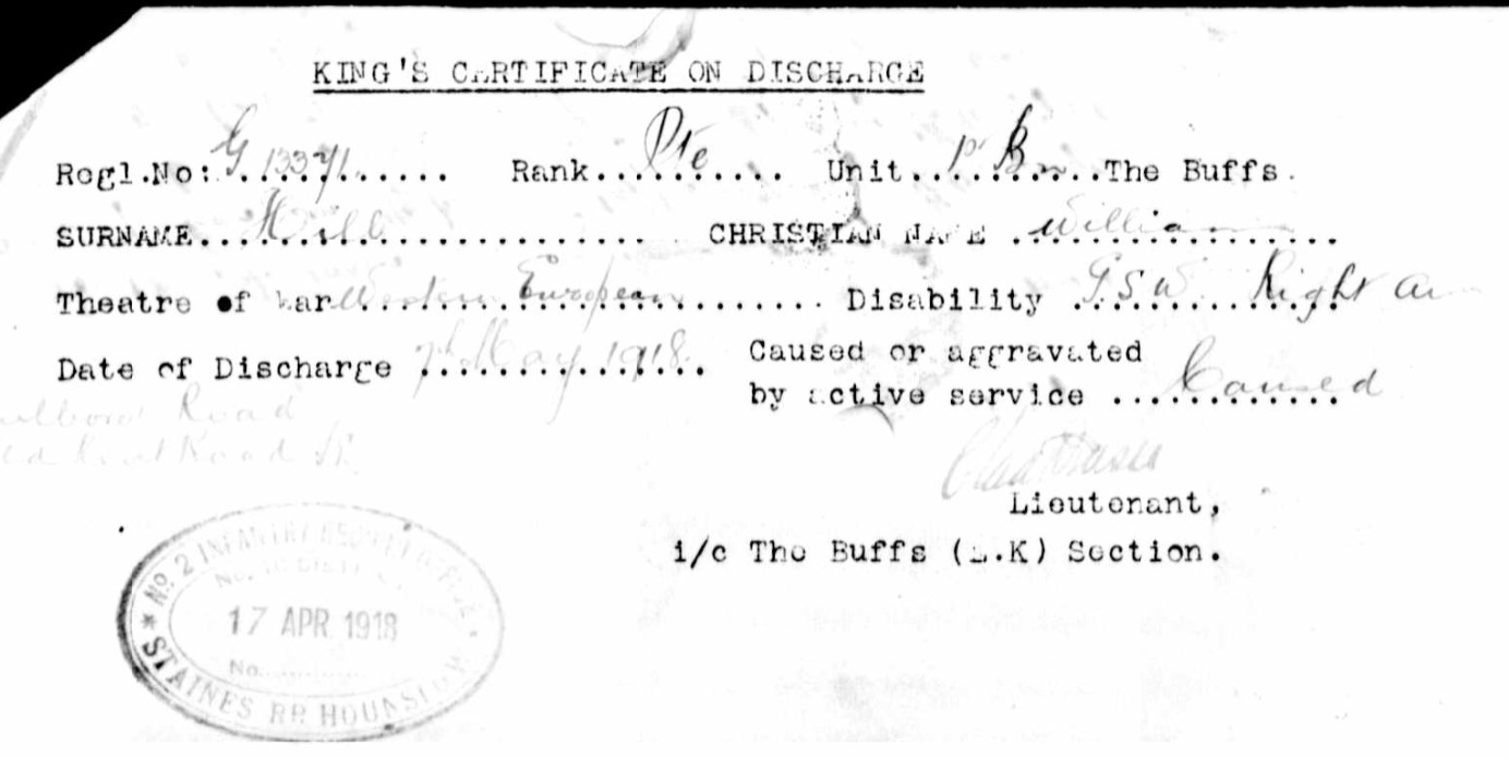 On 29 November 1915, civilian William Hill, a printer of 44 Marlborough Road, Camberwell, signed up as Private 13371, East Kent (The Buffs) Regiment, giving details of his marriage to Emily and his son’s birth. On 16 April 1918 he was discharged as ‘no longer medically fit to be a soldier’, his home address the same as when he joined up three years earlier. He had received a gun shot wound to his right arm on 20 November 1917 and was repatriated on the hospital ship Stad Antwerpen, and was subsequently discharged to a weekly pension.