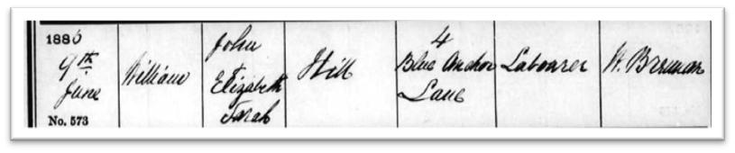 Born on 16 May 1886, William Hill was baptised on 9 June that year at St Augustine’s Church, Lynton Road, Bermondsey. His parents were living at 4 Blue Anchor Lane at the time, his father working as a Labourer.