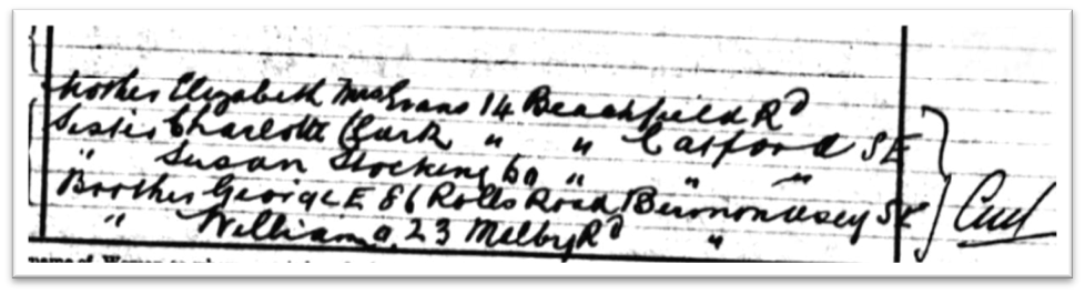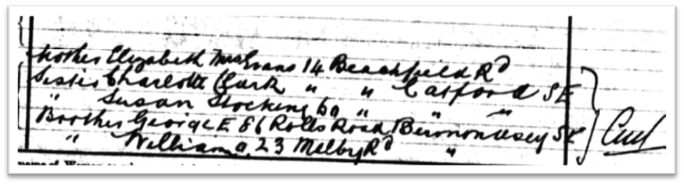 My great grandmother’s youngest brother was born when she was 15 years old, and their mother 42. . He makes his first census appearance in 1891, aged six weeks, and was baptised the day after census night, on 6 April 1891, at St Mark’s, Camberwell. His parents are living at 25 Bowles Road, Camberwell, his father working as a Labourer.