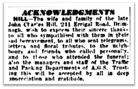 It wasn’t immediately clear whether John was employed by Guinness from 1919 until his death in 1948. It may be that he was owed a pension – or his widow was – from his service. However, an acknowledgement by the family for sympathies received after his death, published in the Dublin Evening Mail on 30 March 1948 suggests he stayed with Guinness:
