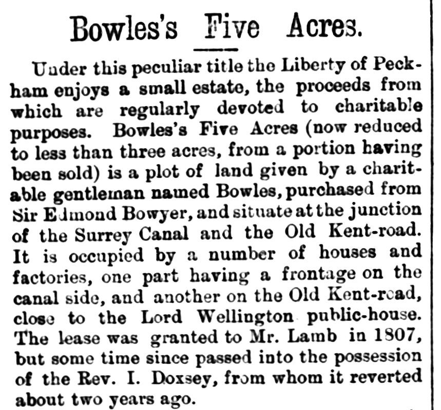 June 1873 saw adverts published in the South London Press for the ‘last remaining plots of building land’ on the Old Kent Road, Canal Bridge, Bowles Five Acre Estate. However, three years earlier, local newspapers gave blow-by-blow accounts of arguments amongst the Charity Estates’ Trustees and the Camberwell Vestry, and the resulting waste of effort and money.