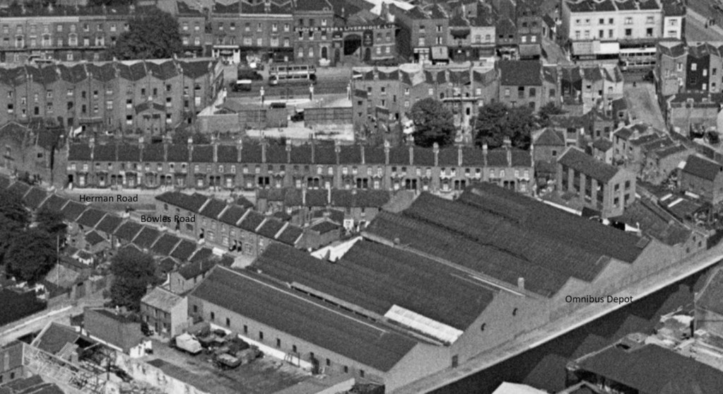 In addition to the 1910-1915 Lloyd George Domesday Survey description of the houses in Bowles Road/Herman Road, I was excited to find aerial photos of the site taken in the 1930s at the Britain from Above website. These show Bowles Road, Herman Road and the surroundings close to the gas works and the Grand Surrey Canal – an industrial area by then in decline. See the original image here.