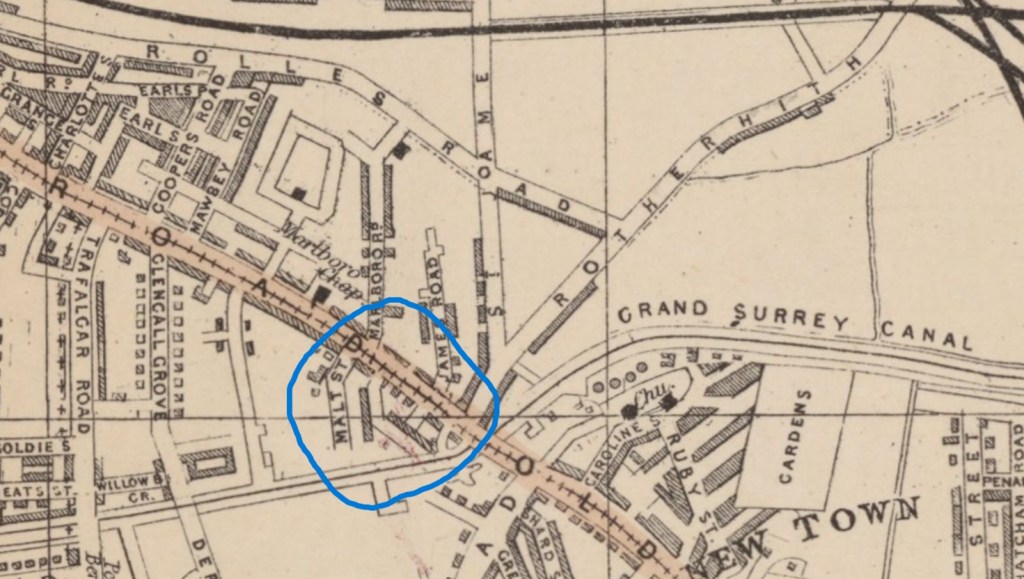The above map has less detail, but you can just see, to the right of Malt Street, that there are two dark rows representing buildings in a vaguely triangular alignment. Bowles Road is the row to the left, not quite reaching the edge of the Grand Surrey Canal, while Herman Road is the diagonal one on the right, parallel to the Old Kent Road.