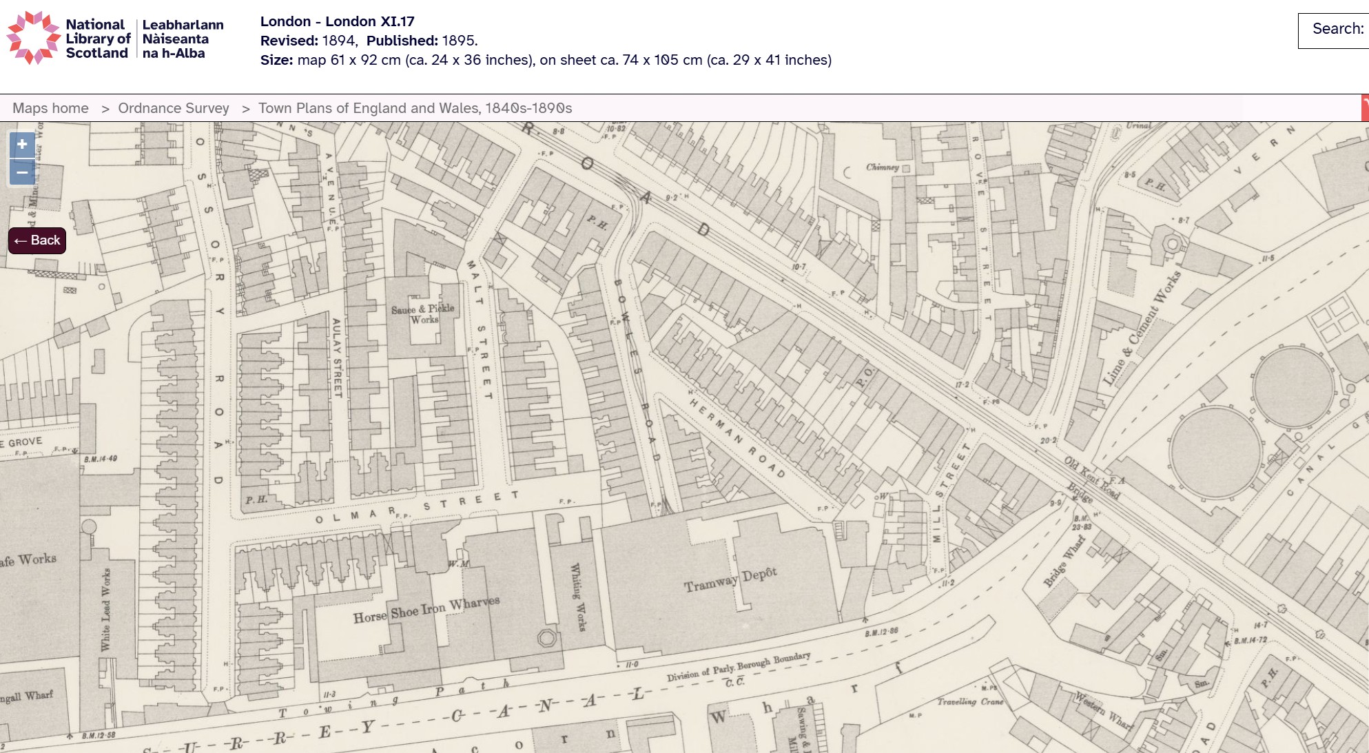 This later map, from 1893, shows the ‘Leg o’ Mutton’ shape of the two roads more clearly, with Bowles Road now carrying tram lines from the Old Kent Road into the Tramways Depot on the canalside and Herman Road running diagonally towards it, parallel to Old Kent Road.