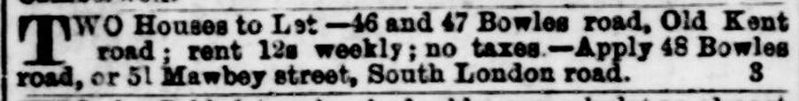 Homes on Bowles Road continued to be advertised for rent during the early 1880s, this example from the South London Observer, 9 July 1884 (FindMyPast):