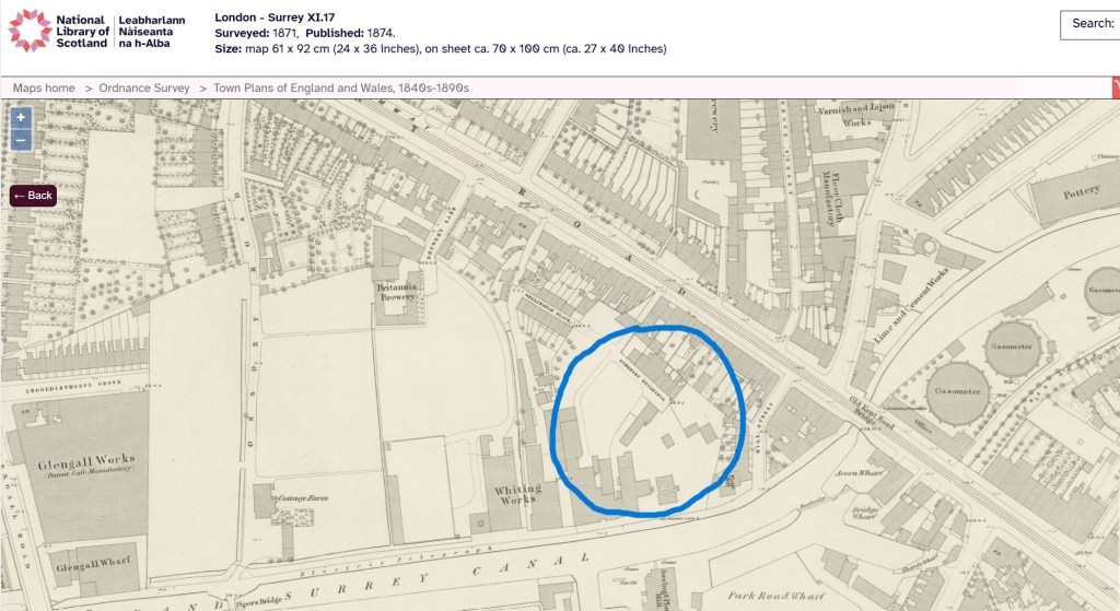 I have circled their approximate location in blue on the extract from an 1871-1874 map below. To the north is the Old Kent Road which runs due East via the Old Kent Road Bridge over the Grand Surrey Canal, which was constructed from the early 1800s. Close by are the gasometers of the Southern Metropolitan Gas Company. The Canal runs along the southern perimeter of the site, with a Flour Mill off Mill Street, and a Whiting Works facing the Canal; an industrial landscape, with a scattering of what look like residential properties in Somerset Buildings, within the circle. See the original map here.
