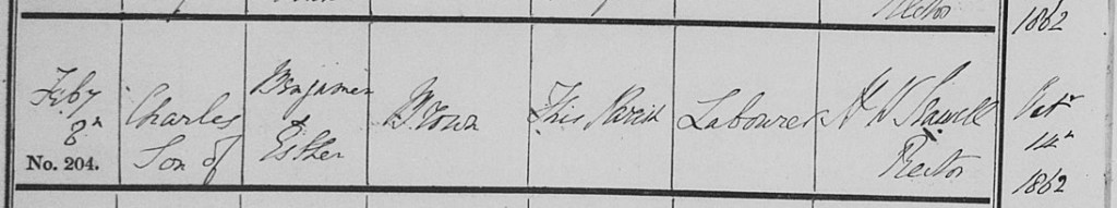I found them living at ‘Gravel Pits’, Little Berkhamsted, Hertfordshire. Head of household Benjamin Brown is 56 (b.1815), born in Benington, Hertfordshire. His wife, Esther Brown, is 40 and hails from Hatfield. In addition to Charles Brown, aged eight, there are three other children: David Brown, born in Hertingfordbury, aged 15; George Brown, aged six and Elizabeth Brown, aged four. All three younger children were born in Little Berkhamsted. No sign, though, of the ‘Annie Brown’ who witnessed Charles’ marriage. Was she living elsewhere, or had she not yet been born?