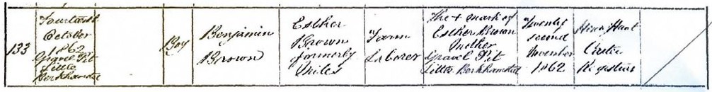 Failing to find a Charles Brown born around 1861-1862 in Hertfordshire in the GRO birth index, I searched for ‘male’ births in the Hertford Union registration district (which included Little Berkhampsted) instead. There was one index entry for the last quarter of 1862 for an unnamed boy, mother’s maiden name Miles. The certificate ordered from the GRO suggested this was the ‘correct’ birth: