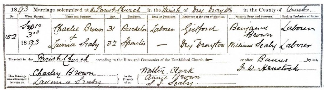 The 1901 census, the first in which Charley and Lavinia appear as a married couple, finds them living at Cambridge Road/Brickhill Road in Sandy. They had married in Dry Drayton in Cambridgeshire, where she lived until moving to London for work. His residence at the time is Girtford, a hamlet near Sandy in Bedfordshire. Neither had been married before, their careers leading them perhaps to marry late in life.