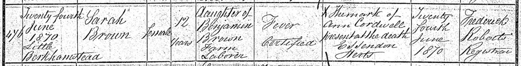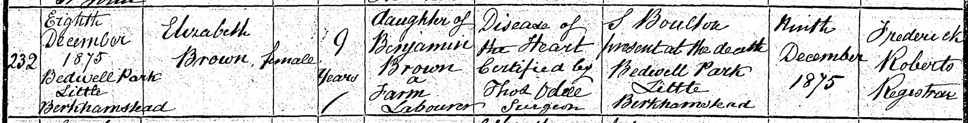 Again, no family member registered her death; the informant was S Boulton, present at the death at Bedwell Park, Little Berkhamsted. The Boultons, Samuel and Sophia, were the Browns’ next door neighbours at Gravel Pits in the 1871 census and presumably still lived close by in 1875.