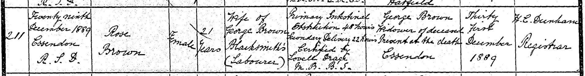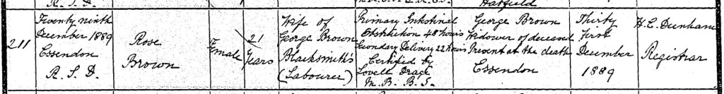 Extract from death certificate of Rose Brown, nee Ephgrave, 1889 (GRO)