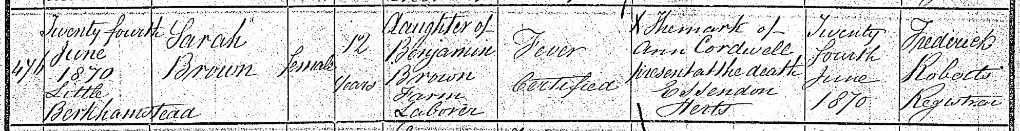 Extract from death certificate for Sarah Brown, 1870 (GRO)