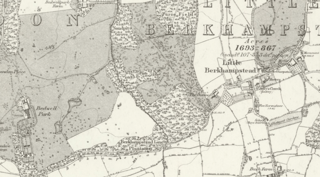 I have not been able to find out anything about ‘Gravel Pit’, the family address in 1871 and on Charles’ birth and baptism records. In the 1861 census, their address is ‘Bedwell Gravel Pit’. Old maps of the area at the National Library of Scotland show Bedwell Park Farm to the west of Berkhamsted (where, incidentally, Charley’s father had worked as a servant before he married Esther Miles), and geological maps show the area is largely gravel, but I have not found any specific place labelled Gravel Pit. The 1861 census schedule enumerates 450 people in the wider village. Following the enumerator’s route on the 1874 map of the area (NLS), it seems likely that the Gravel Pit was located to the north and east, between Bedwell Park and the centre of the village, and later documents give their address as ‘Bedwell Park, Little Berkhamsted’.