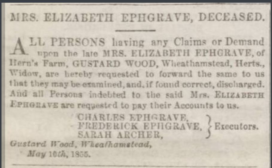 Jesse’s birth was followed by two more children: Eli Ephgrave, born in April 1855 at Mount Pleasant, and Charles, born there in Summer/Autumn of 1857. Their paternal grandparents died around the same time: Thomas Ephgrave, farmer of Hearn’s Farm, Gustard Wood, died of consumption in October 1854 and his wife Elizabeth, of fluid around the lungs (hydrothorax) in April 1855. Their wills named their three surviving children as beneficiaries. On 19 May that year, the Hertfordshire Mercury and Reformer carried a notice asking that creditors of Elizabeth Ephgrave come forward to make claims against her estate, via the executors, Frederick, his brother Charles Ephgrave and their married sister Sarah Archer.