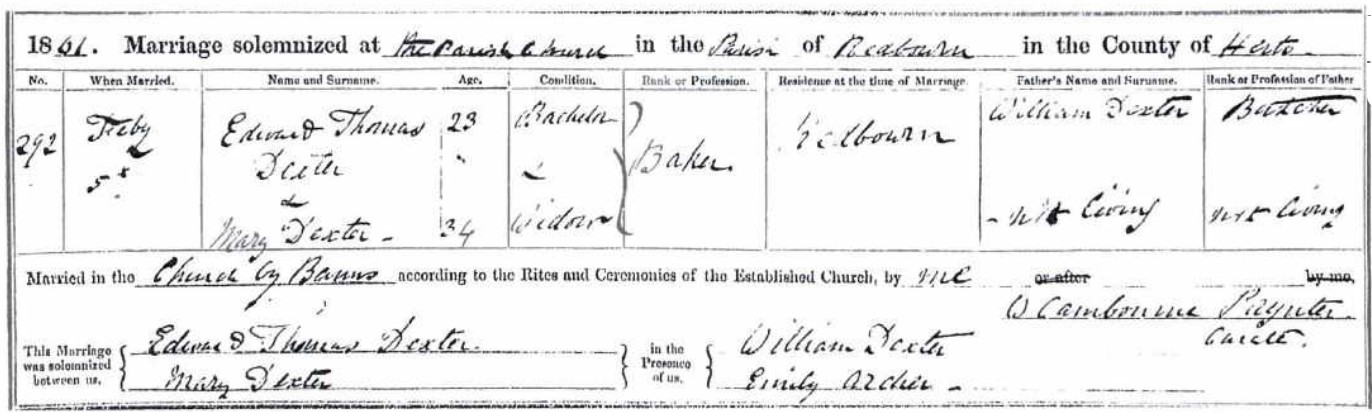 Extract from marriage certificate for Edward Thomas Dexter and Mary Dexter (GRO)