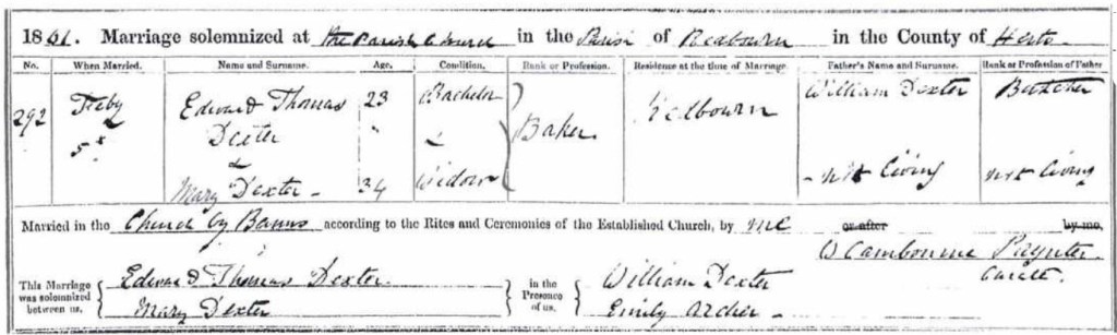 I do not know if Jesse’s mother Mary continued her husband’s bakery business after his death. On 5 February 1861, she married Edward Thomas Dexter at Redbourn’s parish church. She was said to be 34 (actually 37), and was by then a widow with three sons under nine years old. He was 22, unmarried and a baker, originally from Market Harborough some 60 miles away in Leicestershire. His father is named as William Dexter, a Butcher.