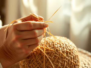 “Straw plaiters worked with a bundle of straws or splints under the left arm, each straw being moistened between the lips before being worked into the plait — this gave many plaiters a characteristic permanent scar at the corner of the mouth. … In order to turn straw plait into a hat, the plait must be sewn in a continuous coil, starting at the crown and ending at the brim. … Most of this hand sewing was done in the home or in small establishments before being sold onto larger firms.”