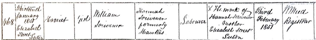 Extract from birth certificate for Harriet Scrivener (GRO)