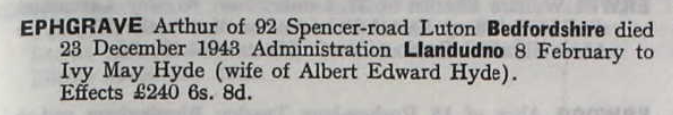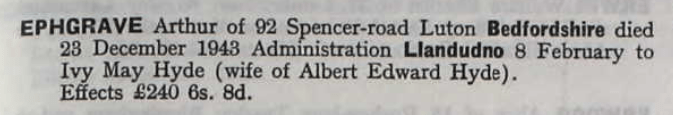 Arthur’s wife Rose died in the last quarter of 1927, aged just 50, the same period in which her younger daughter married. From the mid-1930s, he and both his married daughters and their husbands were registered to vote at 120 and 118 Langley Street. As WWII broke, he was living with Ivy and her husband at Spencer Street in Luton, working as an engineering labourer, probably still at Vauxhall Motors. He died before the war was over, on 23 December 1943. Probate was granted to his daughter Ivy May Hyde: