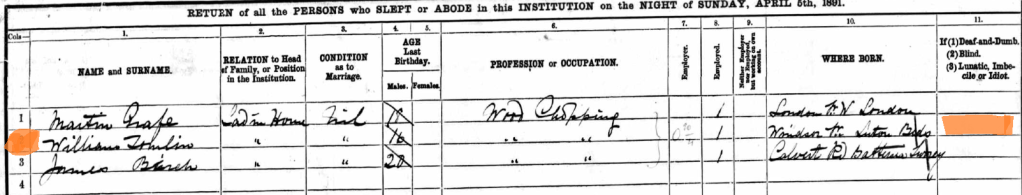 William Tomlin, aged 16, is at Barnardo’s Youth Labour House at Commercial Road, Stepney, undertaking wood chopping and said to be born at Windsor St., Luton, Beds. The Children’s Homes website states that the Labour House was opened in 1882.