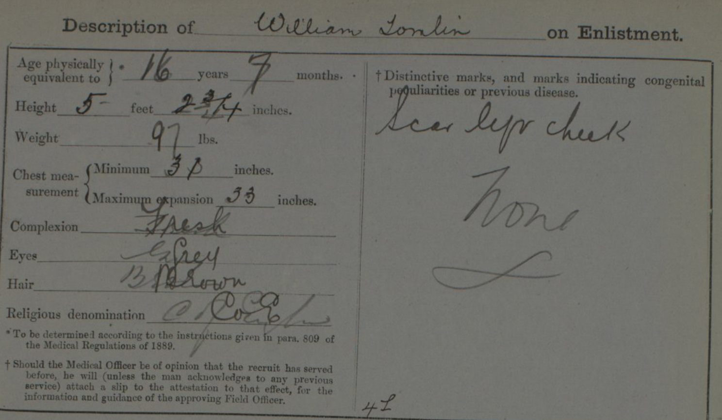 Extract from Militia Attestation for William Tomlin, FindMyPast