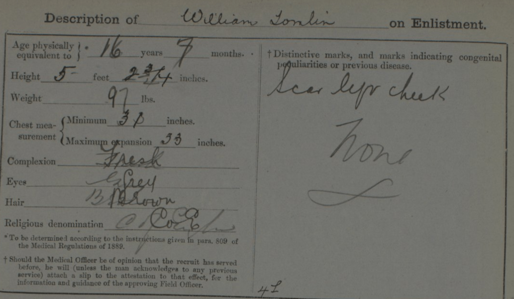 William Tomlin’s interest in the Militia may, perhaps, be explained by an attestation form found at FindMyPast and signed in Luton by a William Tomlin, dated 27 January 1892. This William states that he is resident at 18 Dumfries Road, Luton, is 16 years and seven months old (ie born August/September 1875) and is a Labourer for a C Cooper. Rose’s brother would have been 16 years and six months old. Dumfries Street is quite literally round the corner from Windsor Street, where his family were enumerated in the 1891 census. His description notes his fresh complexion, grey eyes and brown hair, a scar on his left cheek and his short stature (5′ 2 3/4″):