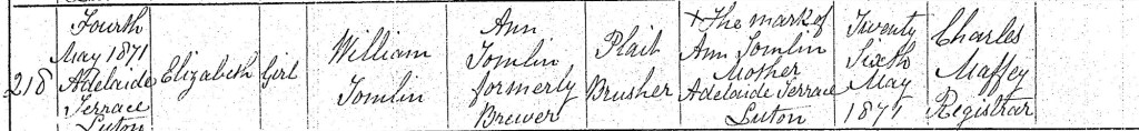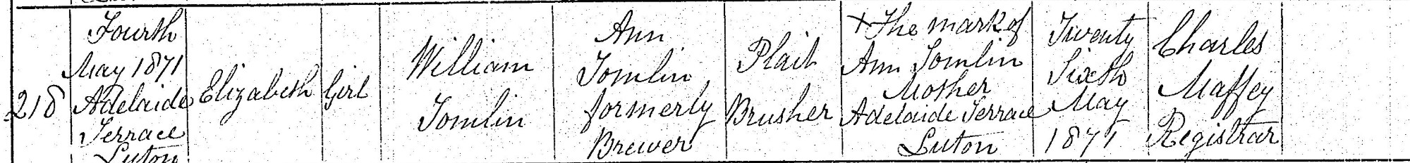 Birth certificate for Elizabeth Tomlin, 1871 (GRO)