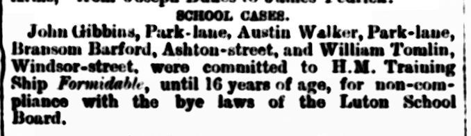 Parents contributed two shillings a week for boys at the school. Is it possible that the local school board caused William to be sent to truant school in London because of his poor school attendance, and sent him back again when his behaviour failed to improve? Unlikely as it seems, another clue from an article in the Luton Times and Advertiser of 15 March 1889 suggests that he was a serial offender.