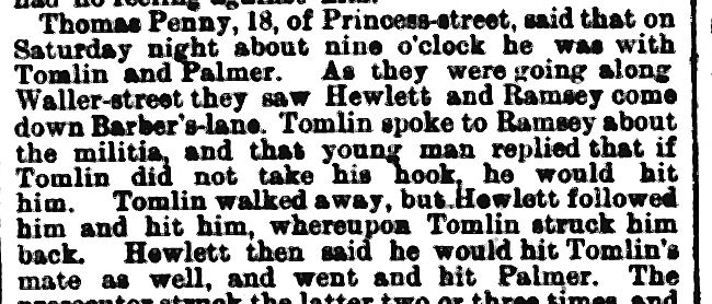 Tomlin seems to have been involved in some pushing and shoving, having asked Hewlett’s companion about the Militia and been told to ‘take his hook’ which I take to mean ‘go away’. The case was referred to the next Assizes, although I haven’t found a further account.