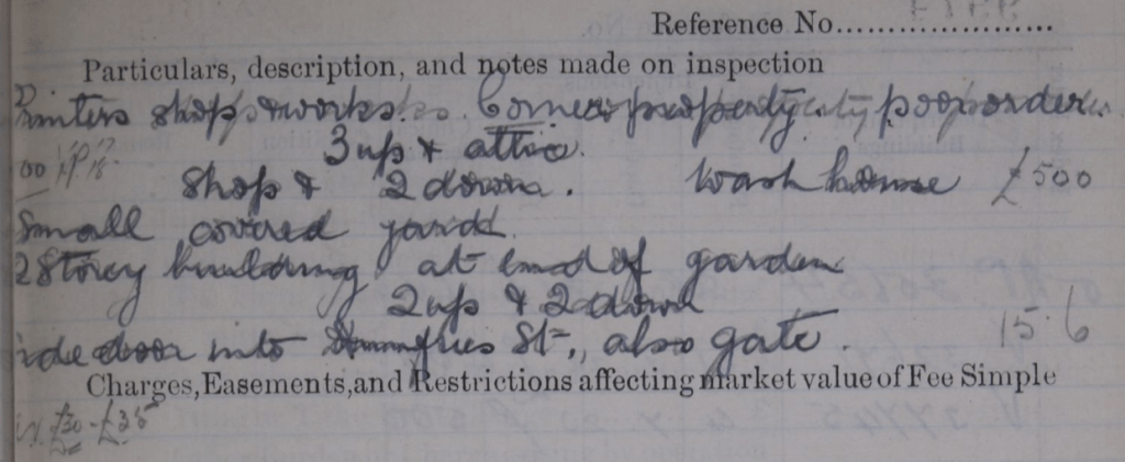 It is a printers shop & works, a corner property in poor order, three [rooms] upstairs and an attic, shop and two [rooms] downstairs. There’s a wash house, small covered yard and a two storey, two up two down building at the end of the garden with side door into Dumfries Street, with gate. The five rooms of the main house match those mentioned in the 1911 census. Google Street View of Wellington Street today shows a somewhat sad-looking property on the corner with Dumfries Street. The numbers may have changed as this is shown as 111.