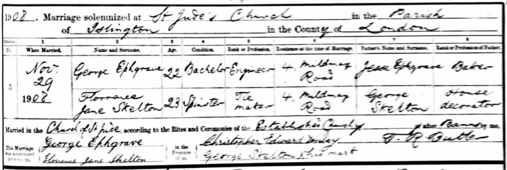 It seems that the rural way of life was not for George. By 1908 he has found his way to Islington in London, where he married Florence Jane Skelton at St Jude’s Church on 29 November that year.