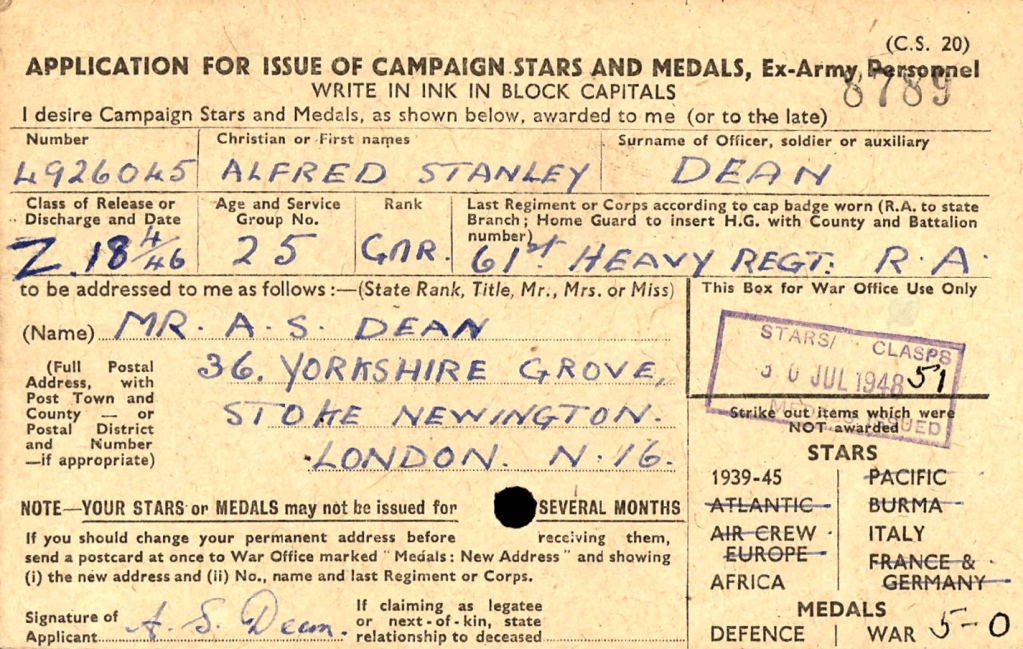 Florence continued to live with her daughter and son-in-law Doris and Alfred Dean at various addresses in Hackney and Stoke Newington until her death in the Jul-Sep quarter of 1963. Alfred Stanley Dean served as a gunner in WWII, in the 61st heavy regiment of the Royal Artillery, and was entitled to the Defence and War medals with 1939-45 star, and stars reflecting his service in Africa and Italy.